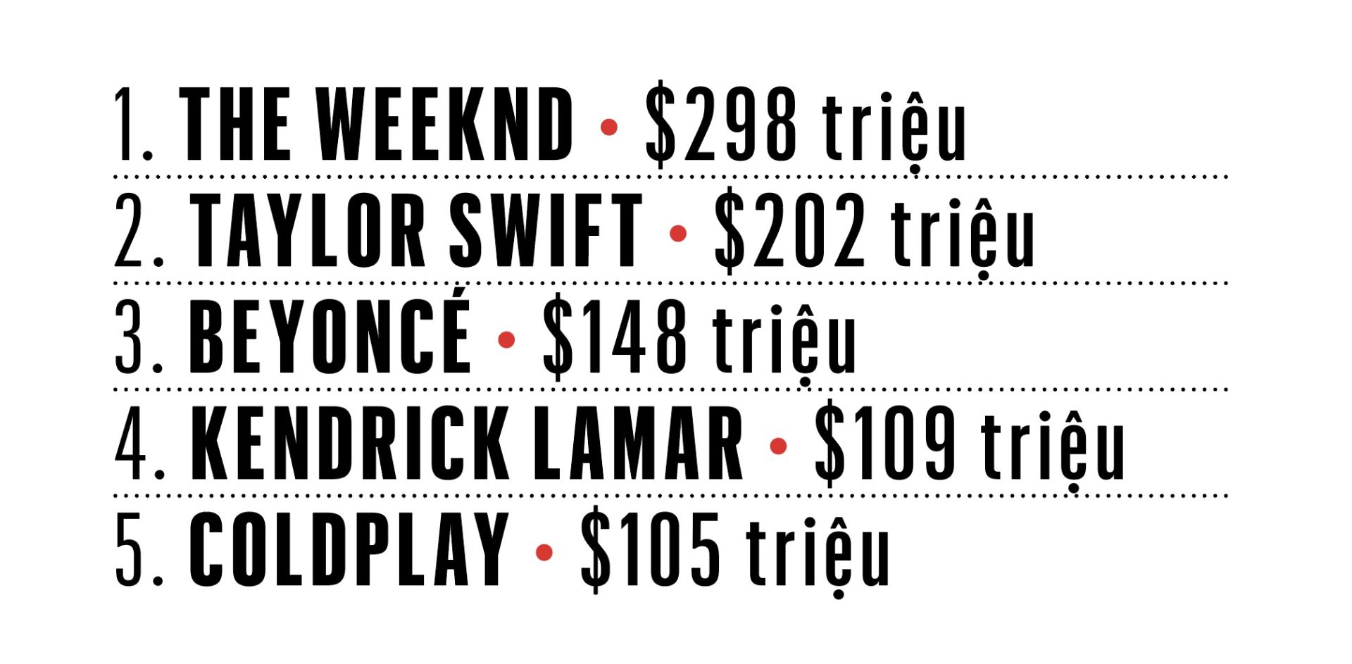 Năm 2025, Beyonce trở thành tỷ phú trong lúc một nữ siêu sao nhạc pop khác có thu nhập hàng tỷ USD, là Taylor Swift bước vào giai đoạn đính hôn nhưng vẫn kịp phát hành album “The Life of a Showgirl”. Tuy nhiên The Weeknd mới là người có thành tích cao nhất. Tháng 12.2025, ngôi sao nhạc pop 36 tuổi này tuyên bố bán bớt cổ phần trong danh mục âm nhạc hiện có của mình cho Lyric Capital với giá 1 tỷ USD. Forbes ước tính anh bỏ túi 200 triệu USD sau thương vụ, kết thúc năm với tổng thu nhập 298 triệu USD. Dưới đây là 5 nghệ sĩ thu nhập cao nhất 2025.