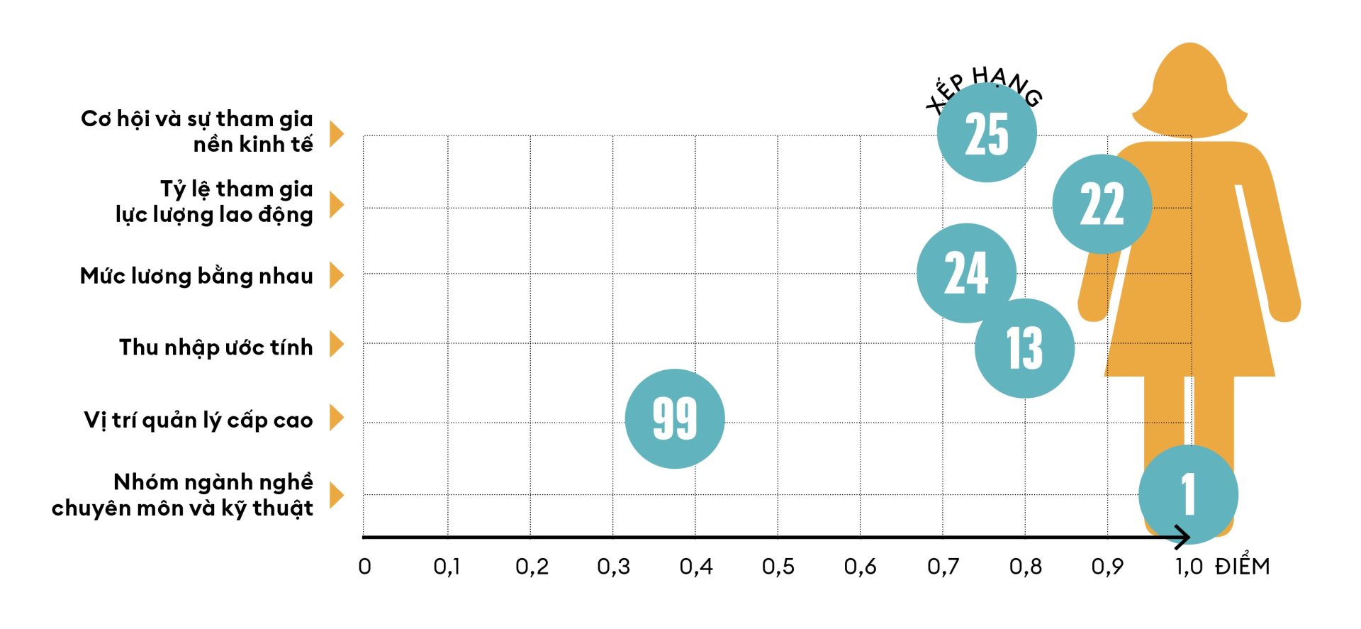Theo báo cáo Khoảng cách giới toàn cầu 2025, Việt Nam tiếp tục đạt thành tựu lớn trong việc thu hẹp khoảng cách giới, đặc biệt về cơ hội và mức độ tham gia của phụ nữ trong nền kinh tế. Việt Nam nằm trong tốp 25 quốc gia có tỷ lệ phụ nữ tham gia lĩnh vực kinh tế cao nhất thế giới.