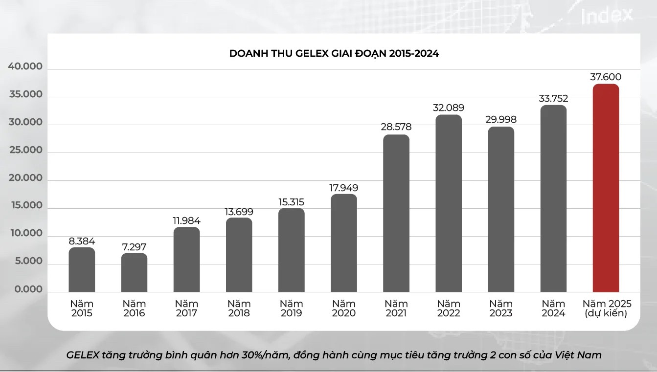 Năm 2025, GELEX đặt mục tiêu doanh thu 37.600 tỷ đồng, mức cao kỷ lục sau hơn 30 năm phát triển, với tăng trưởng bình quân trên 30% mỗi năm.