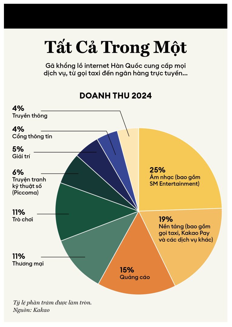Doanh thu của Kakao bắt đầu chững lại sau khi đạt đỉnh 2.000 tỷ won trong quý 3.2023. Trước áp lực tăng trưởng doanh thu và lợi nhuận, nhà sáng lập Kim Beom-su quyết định xoay mũi nhọn sang mảng giải trí. Ông Kim, người nắm giữ 24% cổ phần của Kakao và có tài sản ròng ước tính 5,1 tỷ USD, đã tham gia cuộc chiến thâu tóm “đế chế giải trí” K-pop SM Entertainment, đối đầu với tỷ phú Bang Si-hyuk của Hybe, đơn vị quản lý nhóm nhạc toàn cầu BTS. Cuối cùng, Kakao đã giành chiến thắng, mua lại 35% cổ phần của SM với giá 1,3 nghìn tỷ won vào tháng 3.2023. Tuy nhiên, các công tố viên cáo buộc rằng ông Kim, vốn được xem là người tiên phong trong ngành Internet Hàn Quốc, đã thao túng giá cổ phiếu của SM nhằm ngăn cản Hybe thâu tóm công ty. Ông Kim đã bị bắt vào tháng 7.2024 và hiện được tại ngoại chờ xét xử. Trong thông điệp gửi nhân viên Kakao, ông phủ nhận mọi cáo buộc: “Những cáo buộc đó không đúng sự thật. Tôi chưa bao giờ chỉ đạo hay dung túng cho bất kỳ hành vi phi pháp nào.”