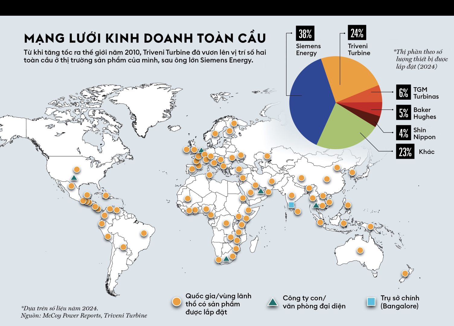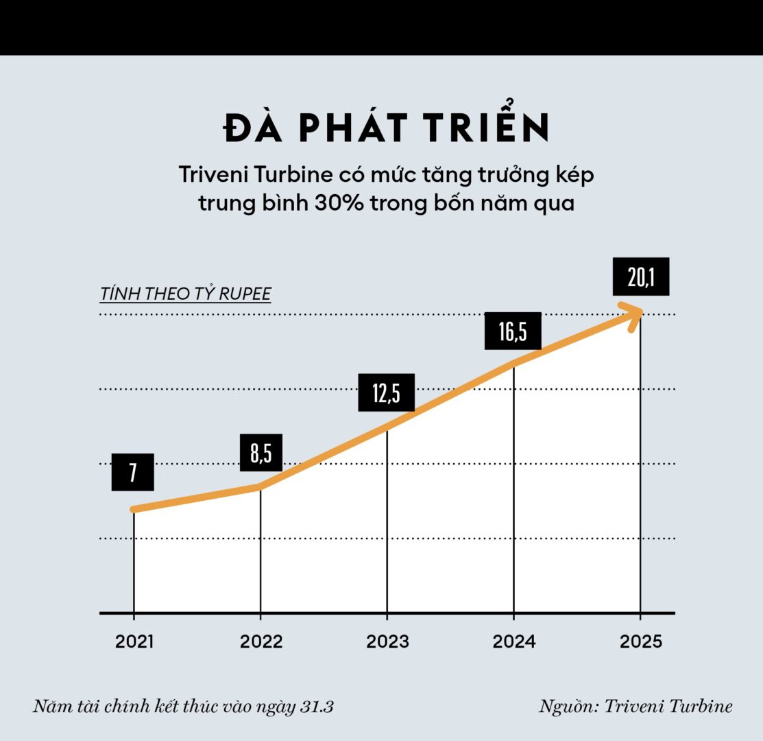 Theo McCoy Power Reports, thị trường turbine hơi nước toàn cầu có công suất lên đến 100MW không bao gồm Nhật Bản và Trung Quốc, đã giảm 28% tính theo gigawatt từ 2014 đến 2024. Tuy nhiên anh Sawhney nhận định, điều này không phản ánh đúng thị trường trong dài hạn. Triveni vẫn duy trì đà tăng trưởng. Xuất khẩu chủ yếu sang châu Âu, Trung Đông và Đông Nam Á chiếm gần một nửa tổng doanh thu trong năm tài chính kết thúc vào tháng 3.2025, từ mức 11% của năm 2011.