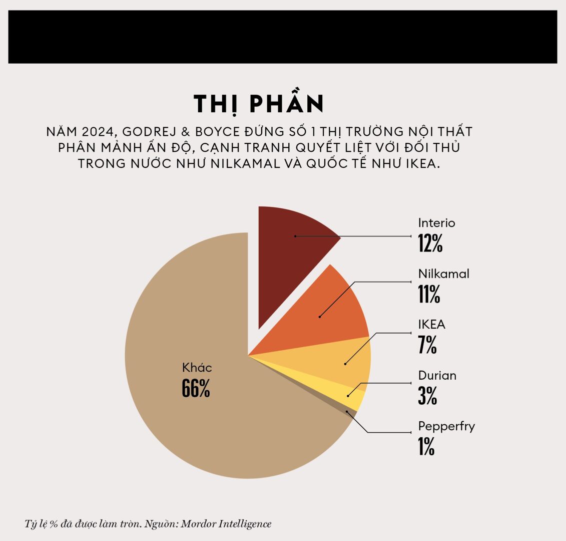 Theo Mordor Intelligence, Interio đứng đầu doanh số tại thị trường nội thất phân mảnh cao ở Ấn Độ, nhưng cũng đang gặp cạnh tranh quyết liệt từ hàng ngàn công ty nhỏ, cùng với các đối thủ lớn như Nilkamal và Durian Industries – cả hai đều có trụ sở tại Mumbai. Ngoài ra còn có tập đoàn khổng lồ IKEA có trụ sở tại Thụy Điển và cửa hàng trực tuyến như Pepperfry được TCC Concept mua lại vào tháng 11. Bà Holkar cho rằng, Interio có lợi thế vì bao quát toàn bộ chuỗi giá trị, từ thiết kế đến các giai đoạn kỹ thuật, chuỗi cung ứng và dịch vụ hậu mãi. Bà Devarshi Mehta, nhà phân tích tại Mordor Intelligence đồng ý với quan điểm trên, dẫn chứng niềm tin của người tiêu dùng trong nhiều thập niên cũng như chất lượng ổn định, quy mô đủ cung cấp trên toàn quốc và mạng lưới phân phối của Godrej rộng lớn.