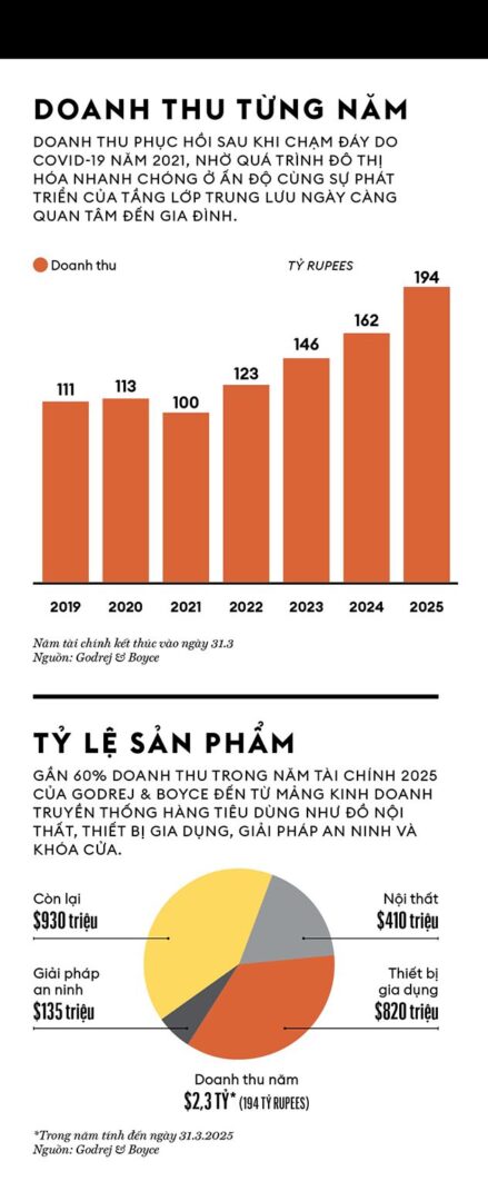 Cái tên Godrej được biết đến rộng rãi tại Ấn Độ, không chỉ vì bộ phận tàu vũ trụ tiên tiến, mà còn một loạt sản phẩm tiêu dùng hàng ngày như khóa, đồ nội thất, tủ lạnh và máy giặt. Trong nhiều thập niên, tủ thép 2 cánh của Godrej đã trở thành vật dụng quen thuộc trong các hộ gia đình trung lưu, dùng cất giữ mọi thứ từ quần áo, bát đĩa, đồ trang sức đến tài liệu. Hàng tiêu dùng chiếm 60% doanh thu trong năm tài chính 2025 của Godrej & Boyce (2,3 tỷ USD). Đây cũng là nơi bà Holkar đang tập trung phần lớn công sức.