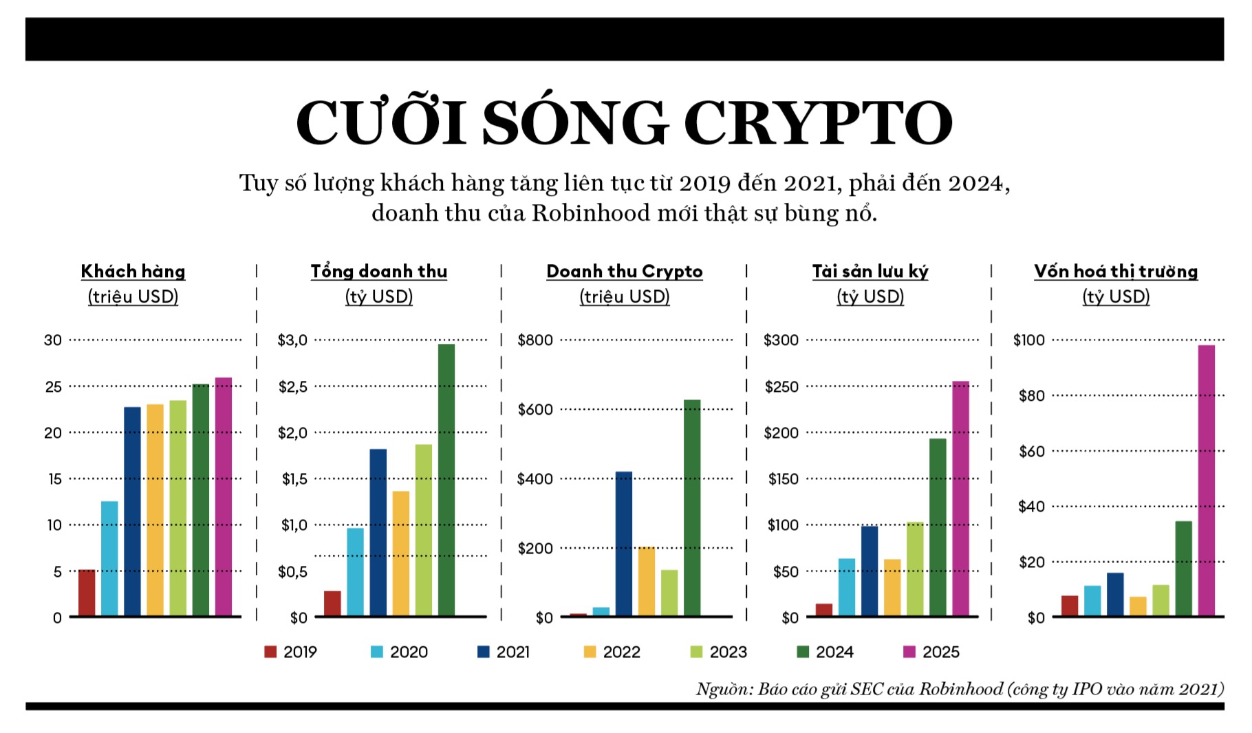 Token hóa có thể là tham vọng dài hạn của Robinhood, nhưng mảng tiền điện tử cốt lõi của công ty hiện đã là một “ông lớn” thực thụ. Năm 2024, doanh thu từ crypto đạt 626 triệu USD, tăng vọt so với 135 triệu USD của năm trước, chiếm hơn một phần ba tổng doanh thu dựa trên giao dịch. Chỉ trong quý đầu năm 2025, con số này đã lên tới 252 triệu USD.