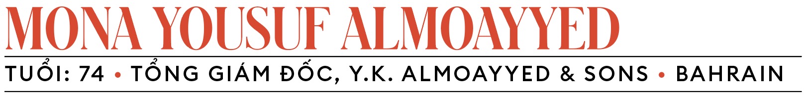 Mona Yousuf Almoayyed là tổng giám đốc điều hành doanh nghiệp gia đình, khởi đầu từ cửa hàng nhỏ ven đường bán trà, đường và cà phê. Ngày nay cửa hàng đã trở thành tập đoàn đa ngành chuyên về ô tô, điện tử, thiết bị công nghiệp nặng và xây dựng. Bà gia nhập công ty năm 1974, đảm nhận vị trí hiện tại từ năm 2000. Bà cũng giữ nhiều vị trí trong hội đồng quản trị. Ngoài ra bà còn là chủ tịch kiêm thành viên sáng lập của Hiệp hội bảo vệ người lao động di cư, chủ tịch Ebdaa về tài chính vĩ mô (Bahrain) và chủ tịch ủy ban điều hành của Diễn đàn phụ nữ Ả Rập quốc tế.