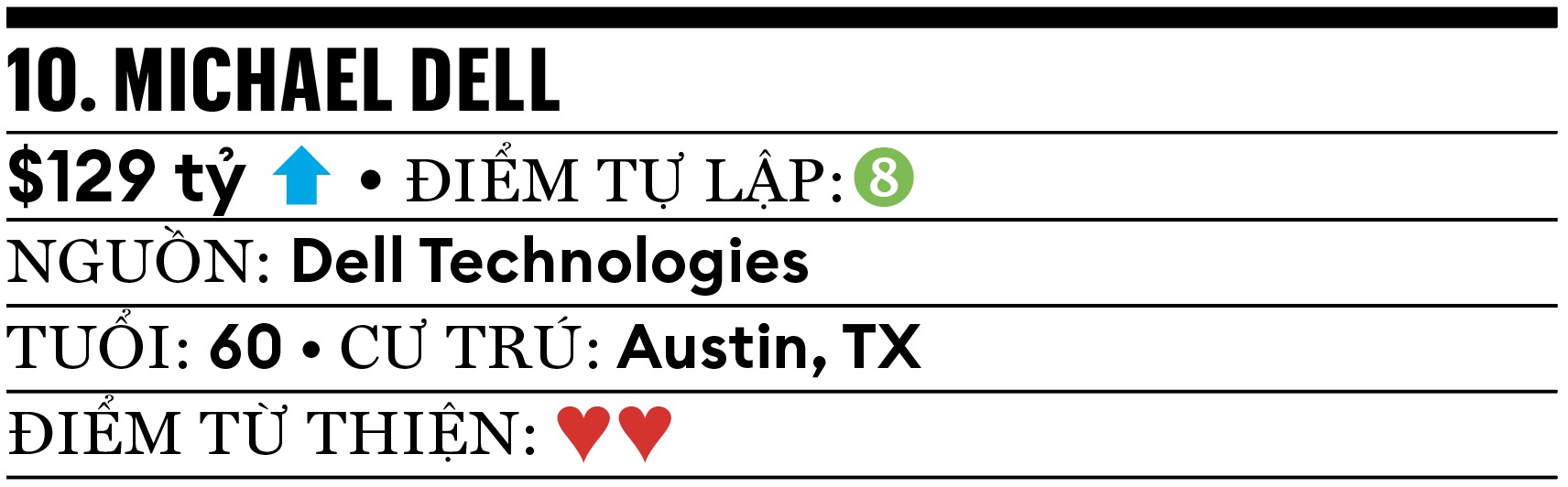 Cựu thần đồng máy tính Michael Dell lần đầu góp mặt trong danh sách Forbes 400 năm 1991 ở tuổi 26, hiện đang dồn lực giúp Dell tăng tốc phát triển AI bằng chip GPU Nvidia. Ông cũng có kế hoạch chi 25 triệu USD mở rộng trụ sở chính của Dell ở Texas trong 5 năm tới. Lý do chính khiến tài sản của ông tăng vọt lên 28 tỷ USD trong năm qua, là nhờ 4% cổ phần ở Broadcom ông có được sau khi gã khổng lồ này mua lại VMware – công ty con về phần mềm đám mây của Dell – vào năm 2023.