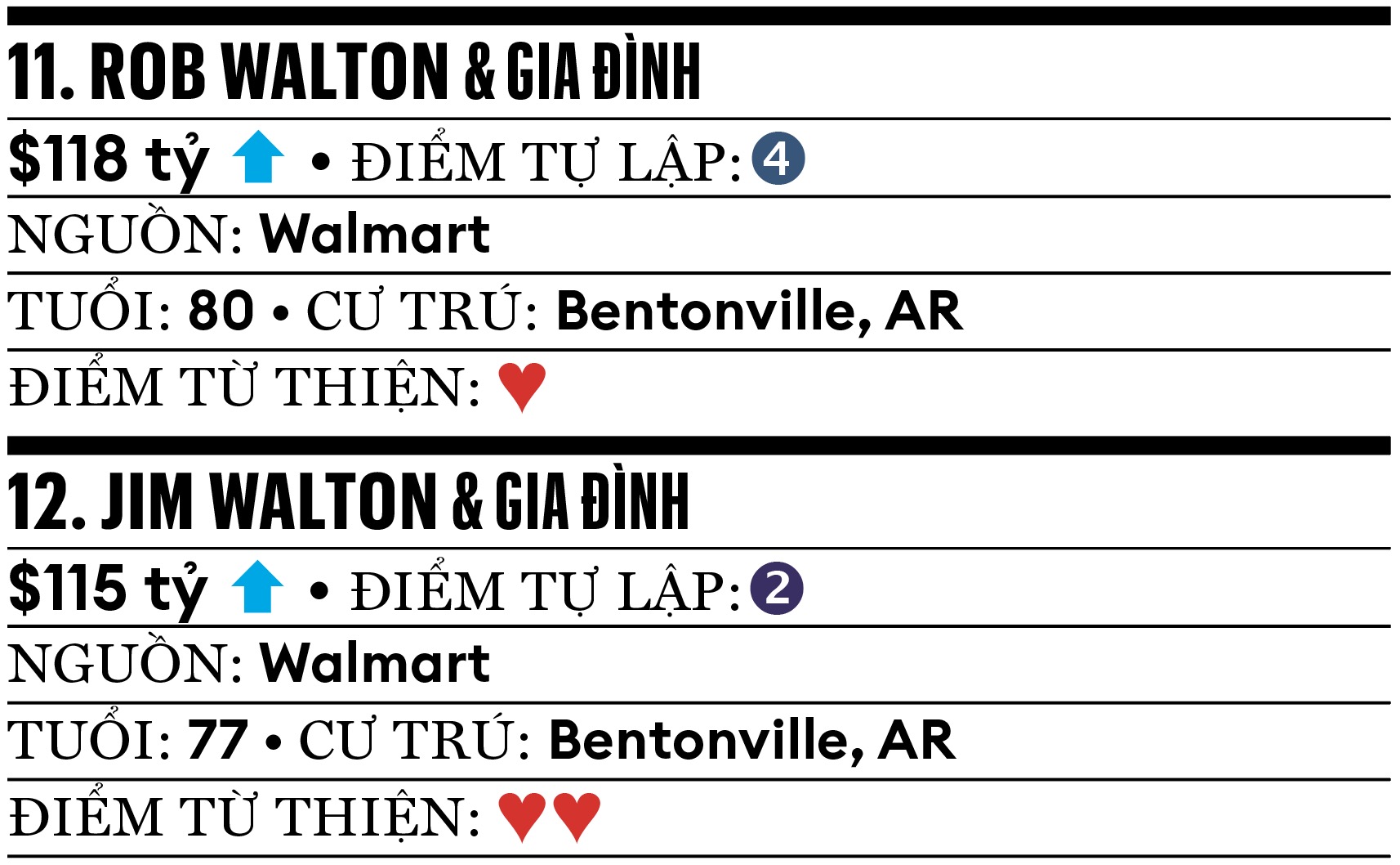 Khi giá cổ phiếu Walmart tăng chóng mặt, 3 người con của nhà sáng lập tập đoàn bán lẻ Sam Walton (mất năm 1992) đều lần đầu vào danh sách Forbes 400 với khối tài sản hơn 100 tỷ USD. Rob, người đã nghỉ hưu khỏi hội đồng quản trị Walmart năm 2024, đã vượt qua anh trai Jim để trở thành người giàu nhất gia đình, một phần nhờ vào đội bóng Denver Broncos đã mua cùng con gái và con rể năm 2022 với giá gần 5 tỷ USD. Forbes ước tính giá trị đội bóng hiện gần 7 tỷ USD. Tháng 5.2025, các con trai của Jim là Steuart và Tom Walton công bố kế hoạch mở trường đại học tập trung vào STEM, với sức chứa 500 sinh viên tại địa điểm văn phòng cuối cùng của ông nội họ ở quê nhà bang Arkansas.