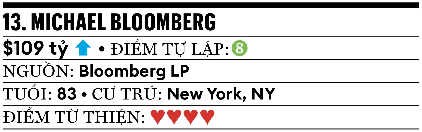 Đồng sáng lập tập đoàn dữ liệu tài chính và truyền thông khổng lồ Bloomberg LP, cũng là cựu thị trưởng New York, hiện vẫn hoạt động chính trị tích cực. Tháng 6, tỷ phú Michael Bloomberg chi hơn 8 triệu USD ủng hộ chiến dịch tranh cử sau đó thất bại của ứng viên Dân chủ Andrew Cuomo cho chức thị trưởng New York. Tháng 8, Bloomberg viết một bài báo chỉ trích Bộ trưởng Y tế Robert F. Kennedy vì lan truyền thông tin sai lệch về vắc-xin và hủy bỏ hợp đồng nghiên cứu phát triển trị giá 500 triệu USD.
