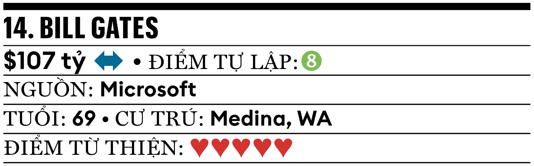 Lần đầu trong 34 năm, Bill Gates không nằm trong danh sách 10 người giàu nhất nước Mỹ. Những tỷ phú khác đang giàu lên, thì ông quyết tâm nghèo đi. Tháng 5.2025, ông nói sẽ quyên tặng 99% tài sản trước năm 2045 khi tròn 90 tuổi. Forbes ước tính, ông đã tặng 7 tỷ USD cho quỹ từ thiện của mình trong năm qua. Tháng 2, ông khẩn cầu Tổng thống Trump không cắt giảm ngân sách cho USAID nhưng thất bại.