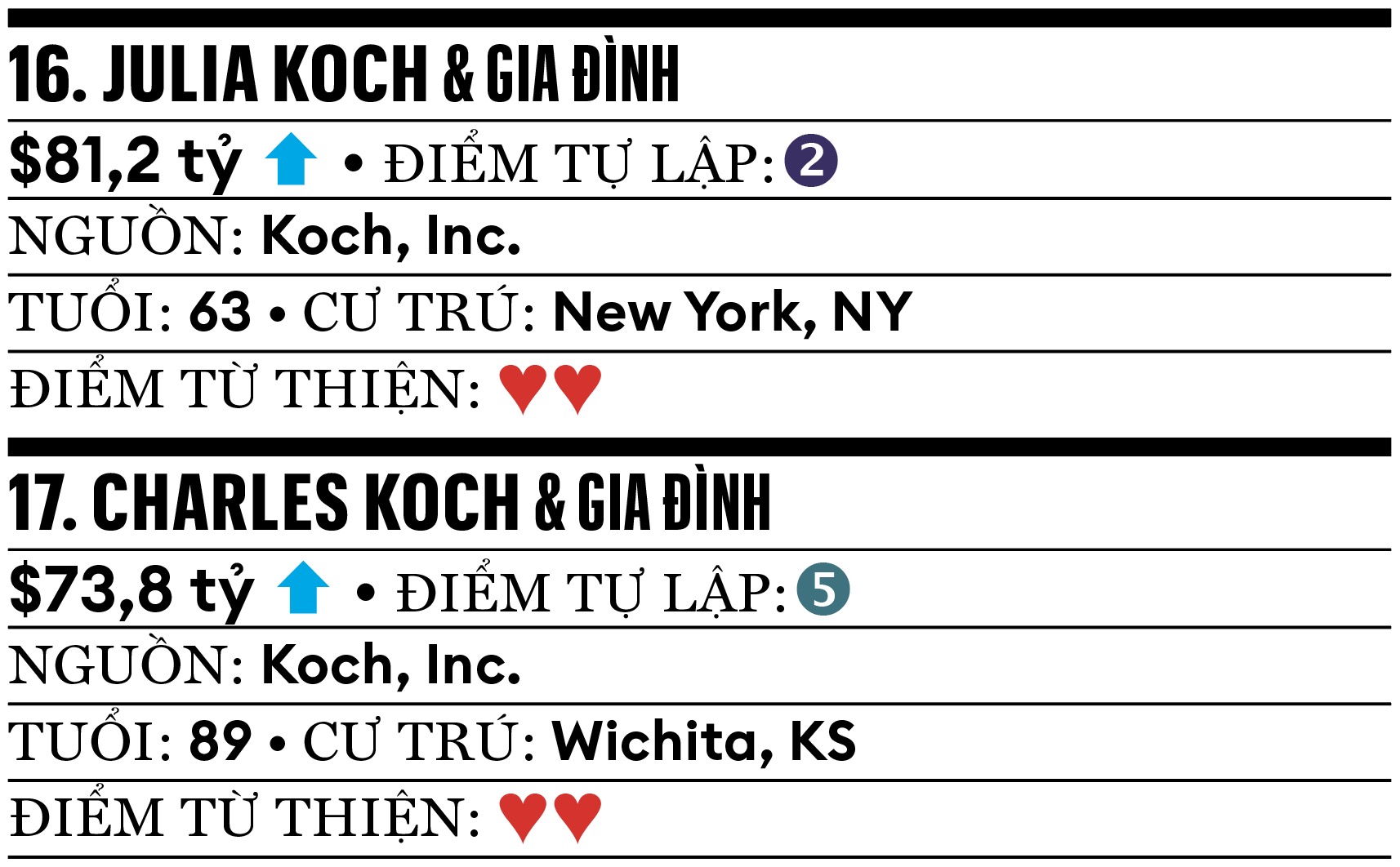Ở tuổi 89, tỷ phú Charles Koch vẫn giữ chức chủ tịch kiêm CEO tập đoàn gia đình Koch Inc, với doanh thu 125 tỷ USD. Tháng 7, ông và 4 tỷ phú khác gồm Steve Ballmer và Bill Gates, cam kết chi 1 tỷ USD thúc đẩy sự dịch chuyển kinh tế thông qua AI. Chị dâu ông, bà Julia và 3 người con của bà, được cho đã đồng ý mua 10% cổ phần đội bóng bầu dục New York Giants trong thỏa thuận định giá đội bóng khoảng 10 tỷ USD vào tháng 9. Họ hiện cũng là cổ đông thiểu số của đội bóng rổ Brooklyn Nets thuộc NBA.