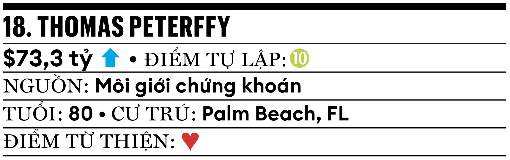 Tài sản của tỷ phú Peterffy tăng hơn 30 tỷ USD trong năm qua, nhờ giá cổ phiếu công ty giao dịch điện tử Interactive Brokers của ông tăng tới 100%, giữa bối cảnh doanh nghiệp này được đưa vào S&P 500. Ông cũng sở hữu 18% cổ phần công ty truyền thông bảo thủ Newsmax, mới niêm yết vào tháng 3.2025.