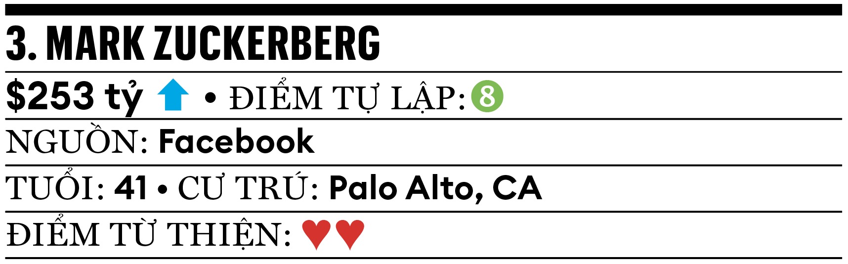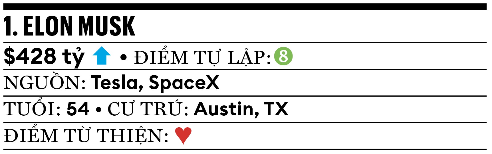 Năm qua là giai đoạn bất ổn với người giàu nhất nước Mỹ. Tỷ phú Musk đã chi hơn 250 triệu USD giúp ông Trump chiến thắng, sau đó có 130 ngày lãnh đạo DOGE. Giờ đây, ông đang kiện OpenAI và CEO Sam Altman, liên quan 2 vụ khác nhau. Dù vậy tài sản của ông vẫn tăng thêm. SpaceX tăng gần gấp đôi giá trị so với năm ngoái lên 400 tỷ USD. xAI và mạng xã hội X hiện trị giá 113 tỷ USD, tăng từ 33 tỷ USD một năm trước. Cổ phiếu Tesla tăng 56% bất chấp các cuộc tẩy chay và doanh số sụt giảm trong nửa đầu năm 2025 (11% so với cùng kỳ năm trước). Là người giàu nhất nước Mỹ năm thứ 4 liên tiếp, tỷ phú Musk cũng là người đầu tiên kiếm được hơn 180 tỷ USD trong một năm và là người đầu tiên vượt qua mốc tài sản ròng 400 tỷ USD. Với ý định giữ chân, hội đồng quản trị Tesla đề xuất gói lương thưởng kỷ lục, có thể mang lại cho ông hàng nghìn tỷ USD tài sản cổ phiếu những năm tới.