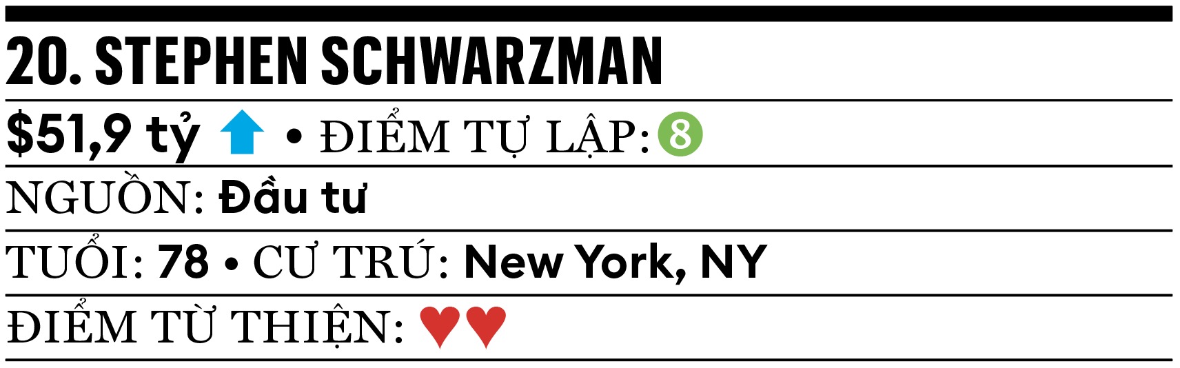 Thuế Quan. Lạm Phát. Thất Nghiệp. Tất cả điều trên không ảnh hưởng đến tài sản các tỷ phú Mỹ. 400 người giàu nhất đang sở hữu 6,6 ngàn tỷ USD, hơn 1,2 ngàn tỷ USD so với một năm trước, nhờ thị trường chứng khoán tăng và AI. Một thập niên trước, cần 1,7 tỷ USD để lọt vào danh sách Forbes 400 và 3,8 tỷ USD để nằm nửa trên bảng xếp hạng. Giờ đây con số 3,8 tỷ USD là tối thiểu. Danh sách năm nay có 14 gương mặt mới, trong đó 4 người sở hữu từ 10 tỷ USD trở lên.
