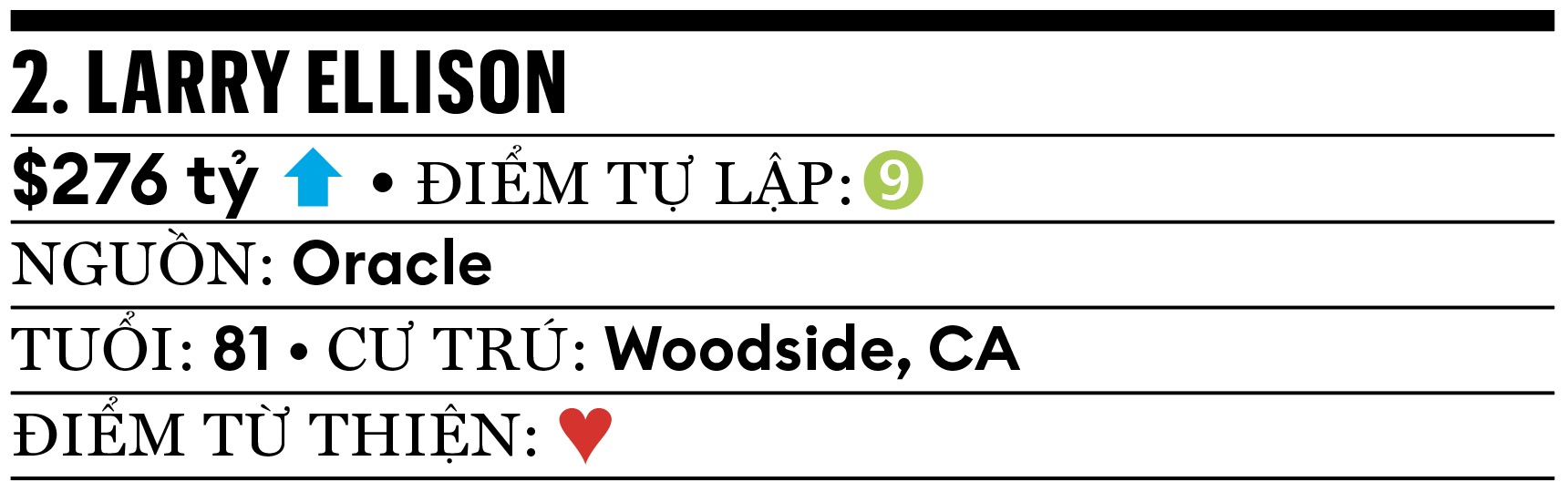 Đồng sáng lập kiêm giám đốc công nghệ của Oracle đã giàu thêm 101 tỷ USD, nhờ giá cổ phiếu công ty phần mềm này tăng 60% trong năm qua, đến từ bùng nổ điện toán đám mây và AI. Mối quan hệ tốt đẹp với Tổng thống Trump, người đã công bố sáng kiến 500 tỷ USD nâng cấp cơ sở hạ tầng AI của nước Mỹ với các bên tham gia chính là Oracle, OpenAI và SoftBank, cũng góp phần vào thành công này. Tháng 7.2025, Tổng thống Trump phê duyệt thương vụ sáp nhập trị giá 28 tỷ USD giữa Paramount Global và Skydance – công ty truyền thông của con trai tỷ phú Larry Ellison là David Ellison.