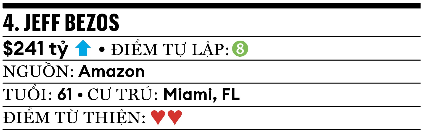 Năm qua, người sáng lập Amazon đã gây ra một số tranh cãi. Ông yêu cầu tờ Washington Post không công khai ủng hộ bà Kamala Harris, chuyển sang trung lập. Công ty hàng không vũ trụ Blue Origin cũng của ông, đã thực hiện chuyến bay toàn nữ lên rìa bầu khí quyển vào tháng 4. Ông còn thu hút sự chú ý với đám cưới 3 ngày tại Venice tiêu tốn 20 triệu USD. Nhiều khách mời “xịn sò” như Bill Gates, Oprah và Ivanka Trump góp mặt. Ông hiện là cổ đông lớn nhất của Amazon với 8% cổ phiếu và có đầu tư vào hơn 100 công ty khởi nghiệp gồm nhiều cái tên đình đám trong làng AI như Perplexity và Physical Intelligence.