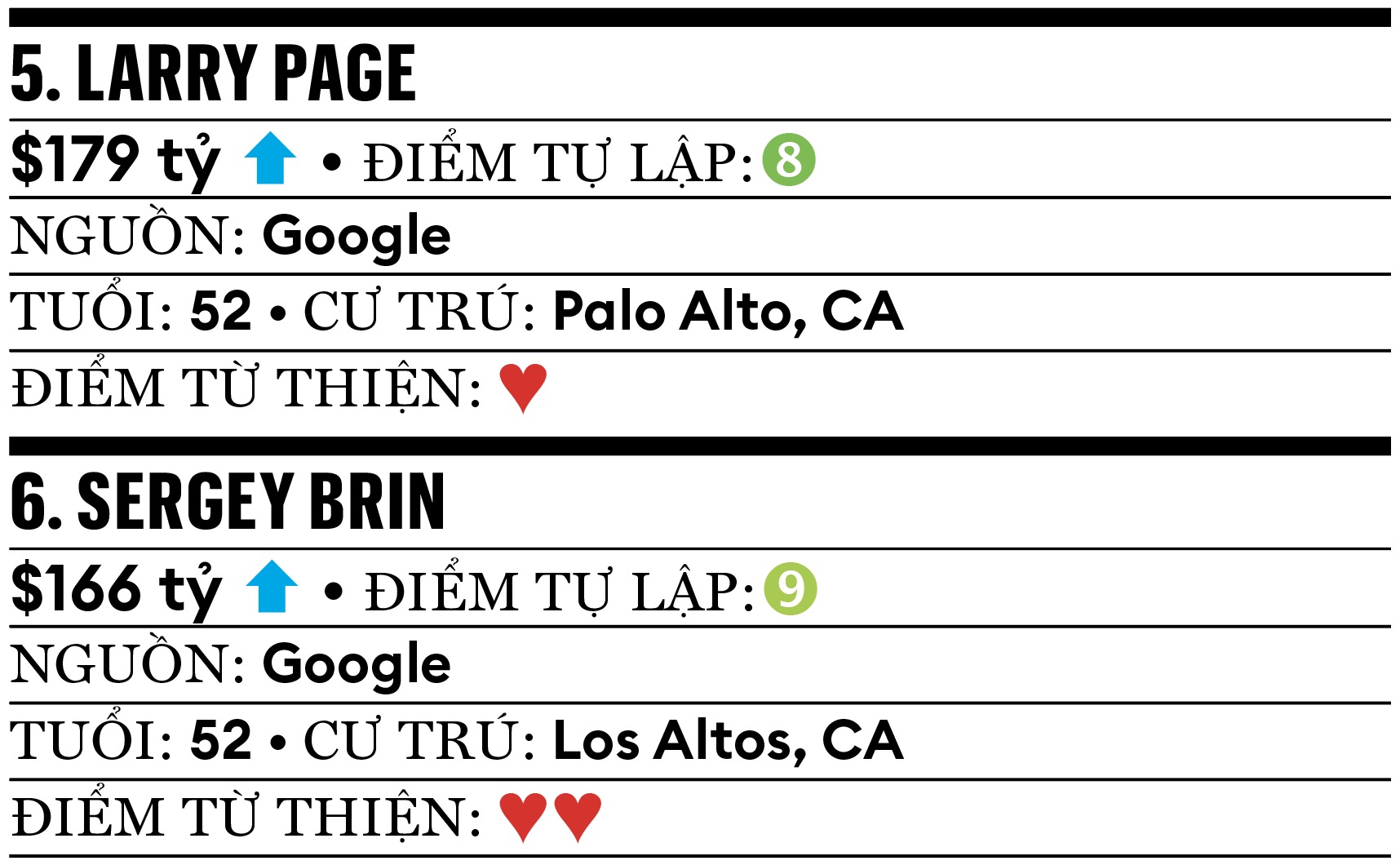 Trong vụ kiện chống độc quyền lớn nhất nhiều thập niên, Google của ông Page và Brin giành chiến thắng lớn vào tháng 9.2025, khi tòa án nói họ không cần bán trình duyệt Chrome bất chấp cáo buộc độc quyền trong tìm kiếm trực tuyến. Cả ông Page và Brin đều sở hữu 13% cổ phần công ty mẹ Alphabet của Google. Giá cổ phiếu tăng vọt sau phán quyết trên của tòa án. Ông Page kín tiếng và tránh xuất hiện trước công chúng, nhưng ông Brin đã trở lại hỗ trợ Alphabet phát triển AI. Tỷ phú Brin đã tham gia bữa tối tại Nhà Trắng vào tháng 9, cùng Tổng thống Trump, Mark Zuckerberg, Bill Gates và nhiều ông trùm công nghệ khác.