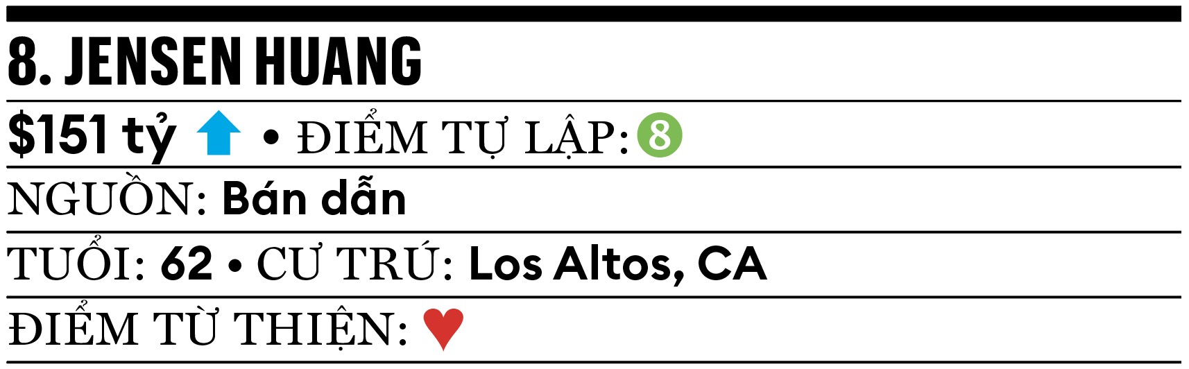 Nvidia hiện có vốn hóa chiếm tới 8% toàn S&P 500, trở thành công ty giá trị nhất toàn cầu vào tháng 7.2025 với hơn 4 ngàn tỷ USD. Tháng 8.2025, CEO Jensen Huang đạt thỏa thuận chưa từng có với chính quyền Tổng thống Trump, khi đồng ý chuyển giao 15% doanh thu tại thị trường Trung Quốc để đổi lấy giấy phép xuất khẩu. Ông Huang nhập cư vào Mỹ năm 1973, đồng sáng lập Nvidia năm 1993 và là chủ tịch kiêm CEO từ đó. Ông có hình xăm logo công ty trên tay trái.