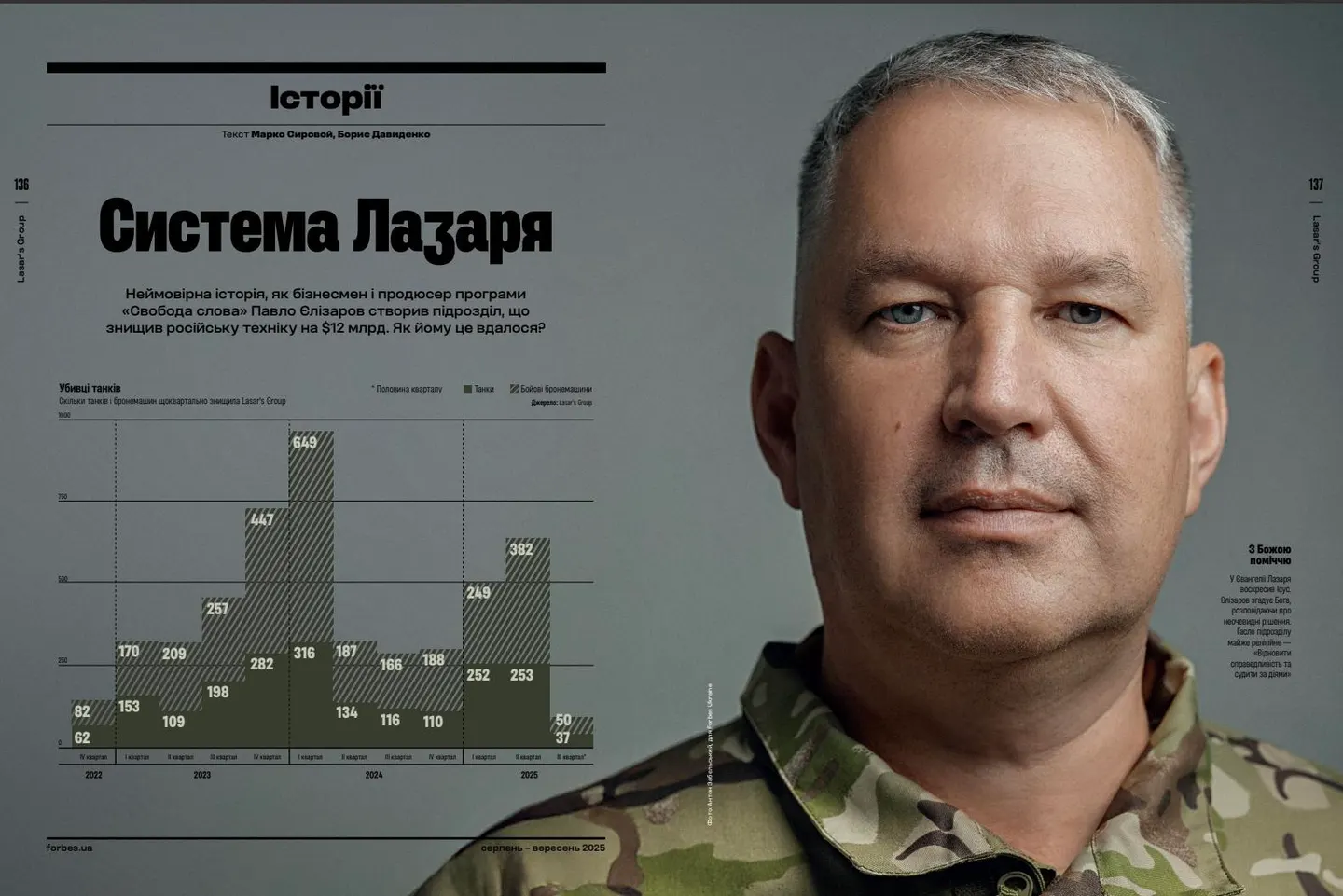 Từ việc sản xuất một talk show truyền hình Ukraine, Pavlo Yelizarov chuyển sang tạo lập và điều hành một đơn vị máy bay không người lái thành công trong quân đội nước này, theo nguồn tin độc quyền của Forbes Ukraine. Theo báo cáo từ đơn vị, Biệt đội của Yelizarov mang tên Lasar’s Group đã phá hủy lượng khí tài quân sự đối phương trị giá 12 tỷ USD, bao gồm hơn 2.000 xe tăng và 3.000 xe chiến đấu bộ binh.