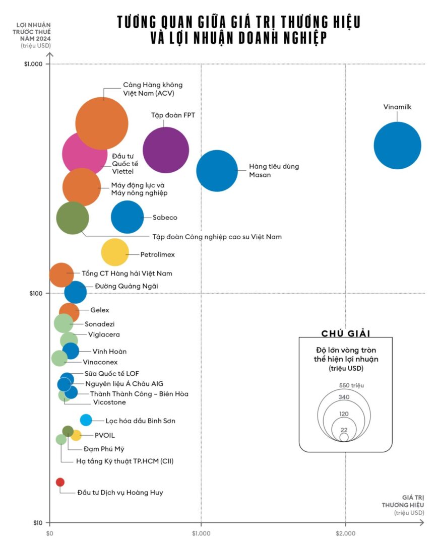 Danh sách 25 Thương hiệu niêm yết dẫn đầu năm 2025 do Forbes Việt Nam công bố cho thấy Vinamilk vẫn giữ ngôi đầu tuyệt đối về giá trị thương hiệu, đại diện cho ngành thực phẩm và đồ uống. Các trụ cột mới như công nghệ, bán lẻ và viễn thông đang vươn lên mạnh mẽ. Hàng tiêu dùng Masan và Tập đoàn FPT là ví dụ cho mối tương quan giữa thương hiệu mạnh và lợi nhuận cao. Trong khi đó, các “cỗ máy kiếm tiền” như Cảng Hàng không Việt Nam (ACV) hay Tổng CTCP Đầu tư Quốc tế Viettel dù đạt lợi nhuận cao, nhưng giá trị thương hiệu vẫn chưa tương xứng.