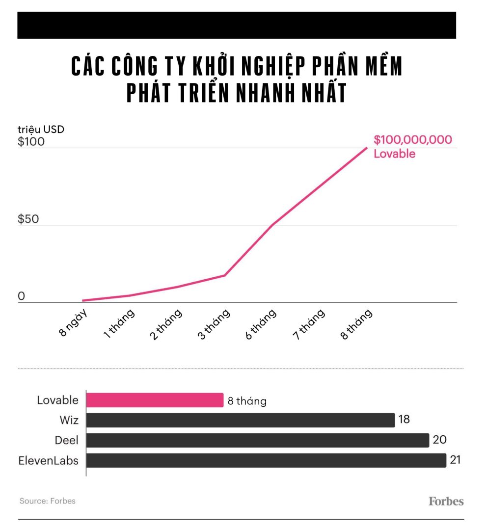 Lovable đã trở thành startup phần mềm phát triển nhanh nhất lịch sử, đạt mốc 100 triệu USD doanh thu từ lượt đăng ký (tính theo doanh thu hàng năm) chỉ sau tám tháng kể từ khi ra mắt vào tháng 11.2024. Thành tích này vượt mặt nhiều startup tăng trưởng thần tốc khác như startup bảo mật đám mây Wiz (Israel) và nền tảng nhân sự Deel (San Francisco). Cụ thể, hai công ty này đã mất lần lượt 18 tháng và gần hai năm để đạt được cùng cột mốc đó. Anton Osika (35 tuổi), đồng sáng lập kiêm CEO của Lovable, chia sẻ: “Bản chất con người là thích tạo dựng. Nhưng trước đây, khả năng lập trình hoặc có nguồn vốn dồi dào là yếu tố quyết định để có thể xây dựng phần mềm. Giờ thì chúng ta đang bước sang một kỷ nguyên mới.”