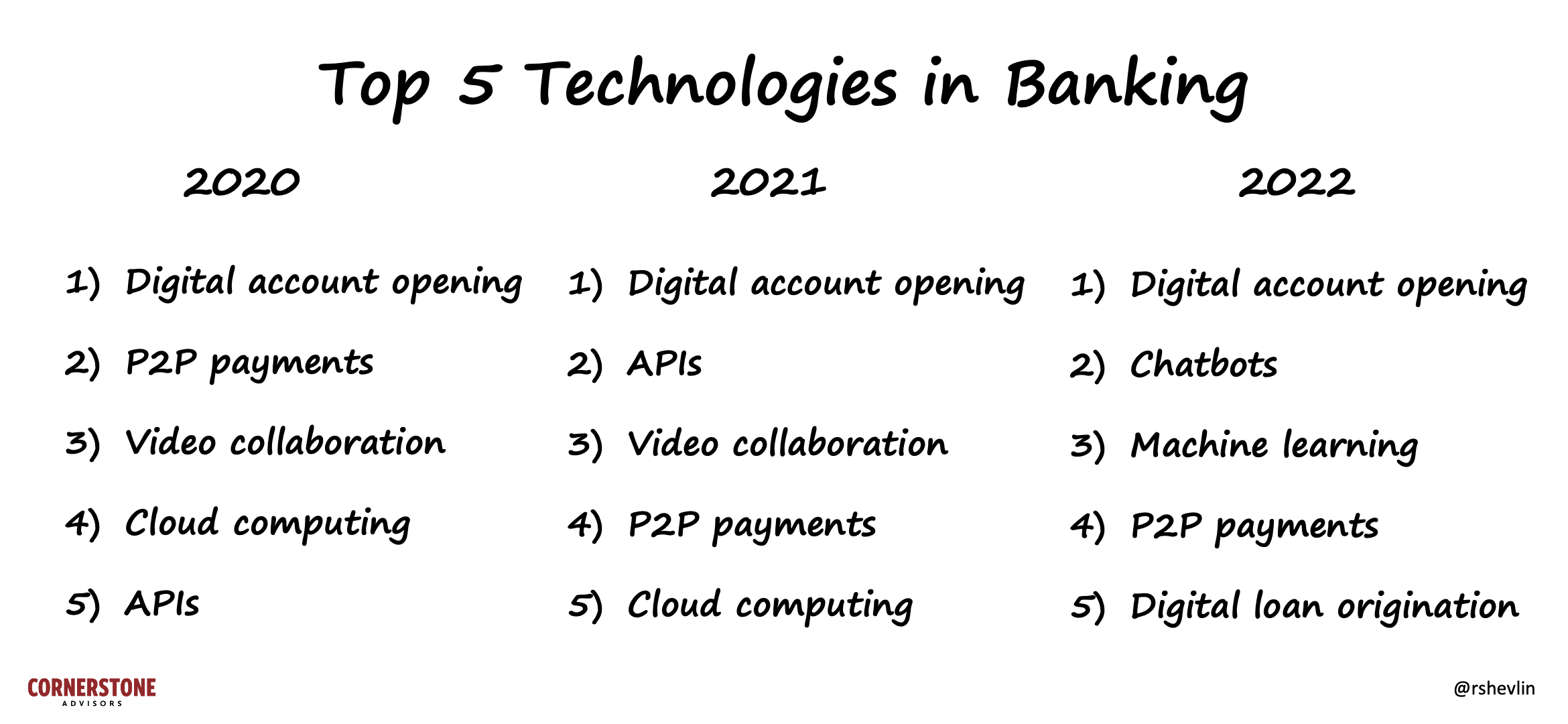 Vào cuối năm 2015, Cornerstone Advisors đã làm khảo sát các tổ chức tài chính để tìm ra công nghệ ngân hàng sẽ như thế nào trong nhiều năm tiếp theo. Nghiên cứu The What’s Going On in Banking (Tình hình của Lĩnh vực Ngân hàng) 2022 hé lộ một vài quá trình chuyển đổi công nghệ tập trung vào trong những năm tới.